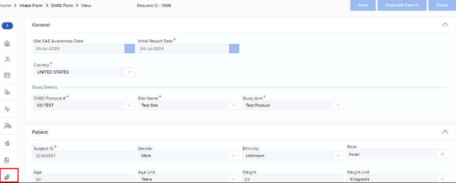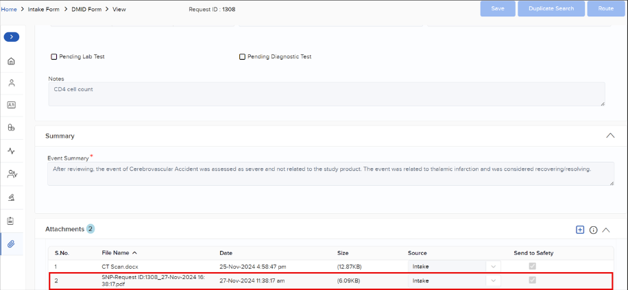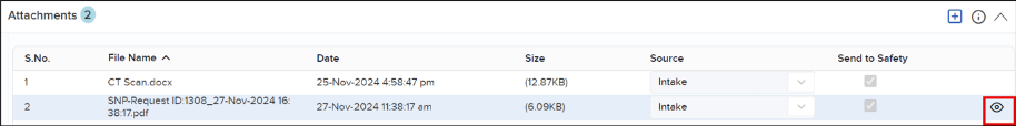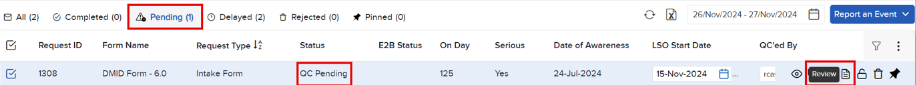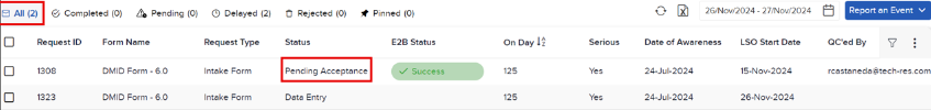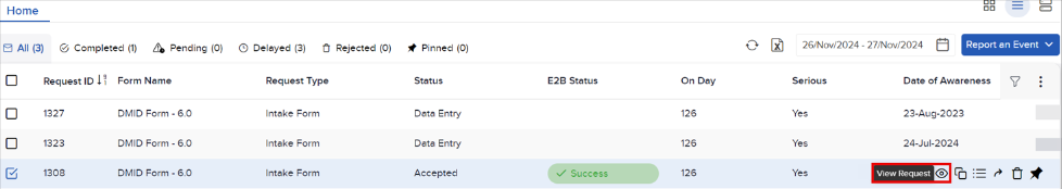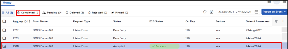 • From the dashboard (Home) Completed tab, select the desired request with the E2B Status (). Please ensure that a correct date range is selected to view the desired request.