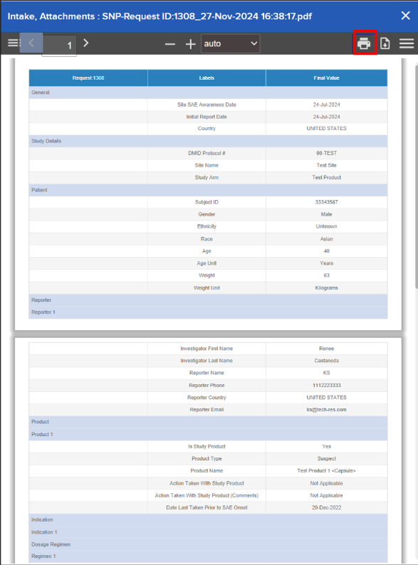 • The information that was submitted to DMID-CROMS PVG will appear. Click the Print icon () shown at the top of the Attachment view to print a hardcopy of the request. To save a copy of the report as a PDF to your local drive, click the Download icon ().